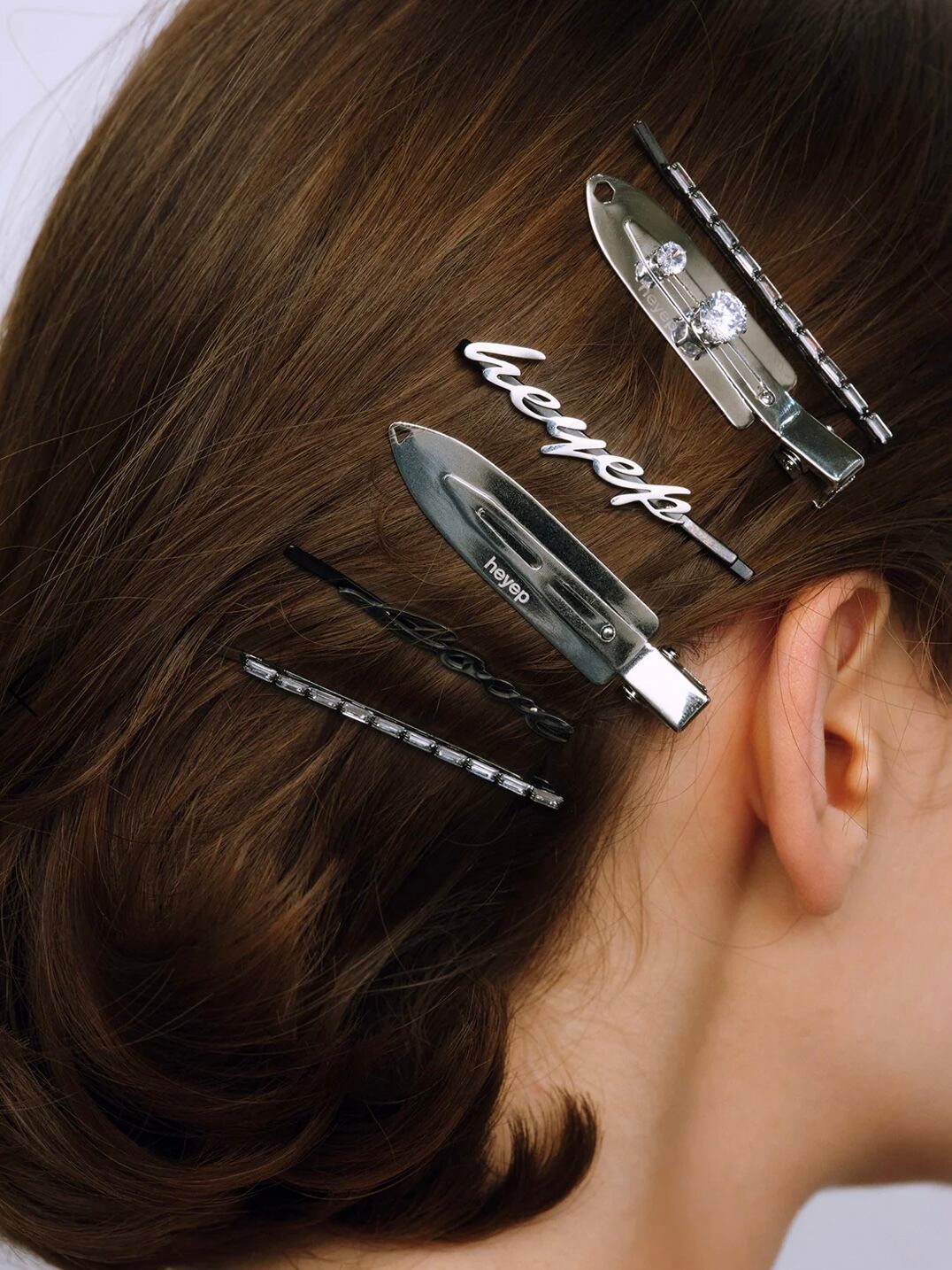 シルバートーンのミニマルなデザインのヘアクリップ(大小のラインストーン付き)