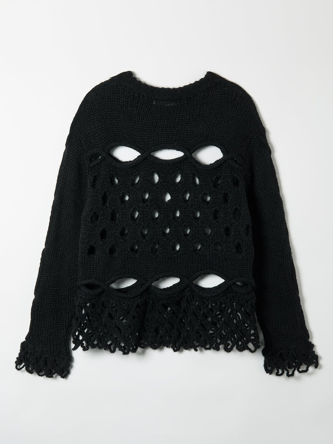 ケーブル編みの網目をたくみにくり抜いたデザインが特徴的なリラックスシルエットのモヘアニット。