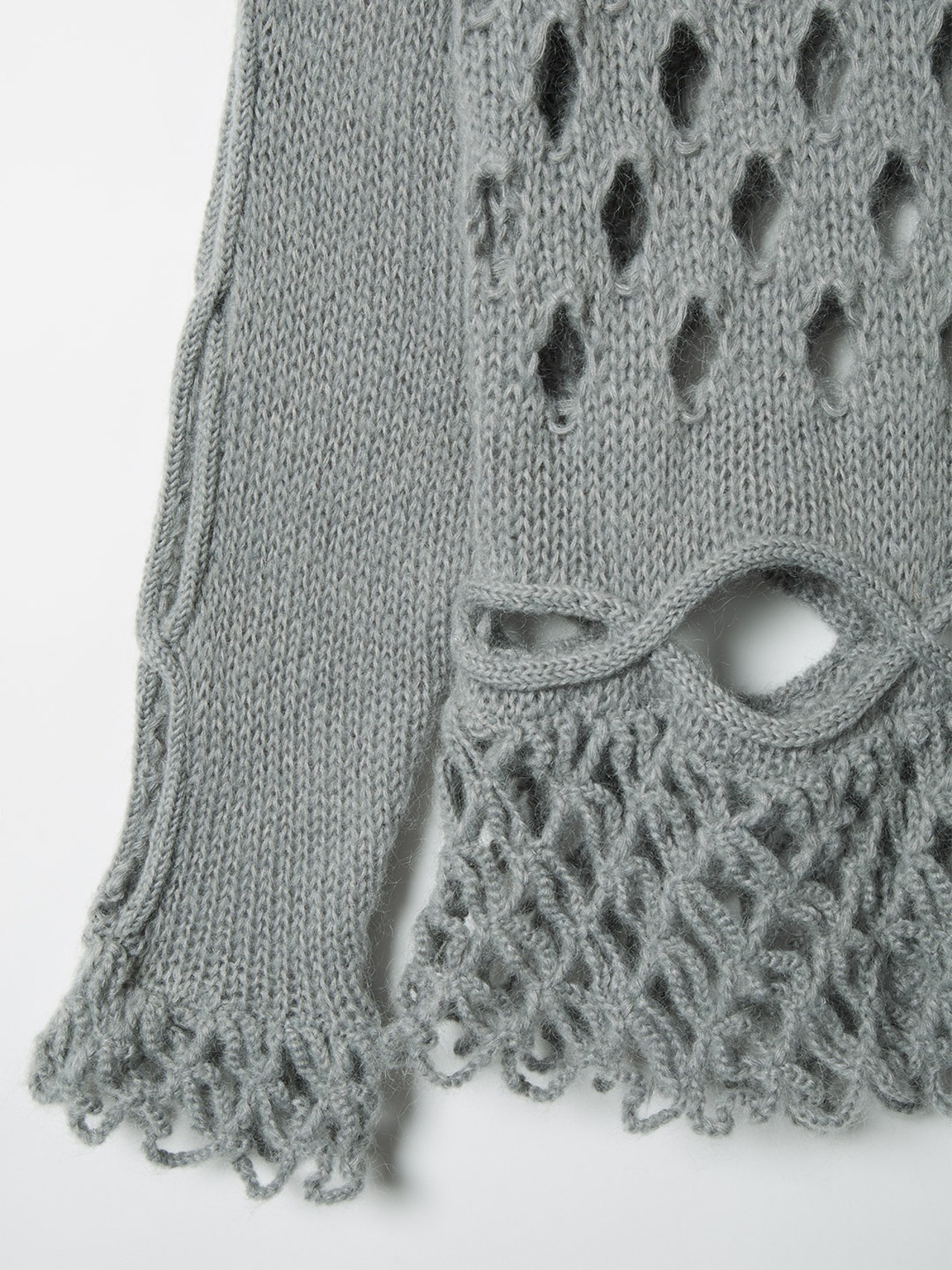 ドットメッシュの網と組み合わせ、裾と袖口にはネット状のフリンジをかぎ針であしらい、繊細でありながらも動きのあるデザインにしました。