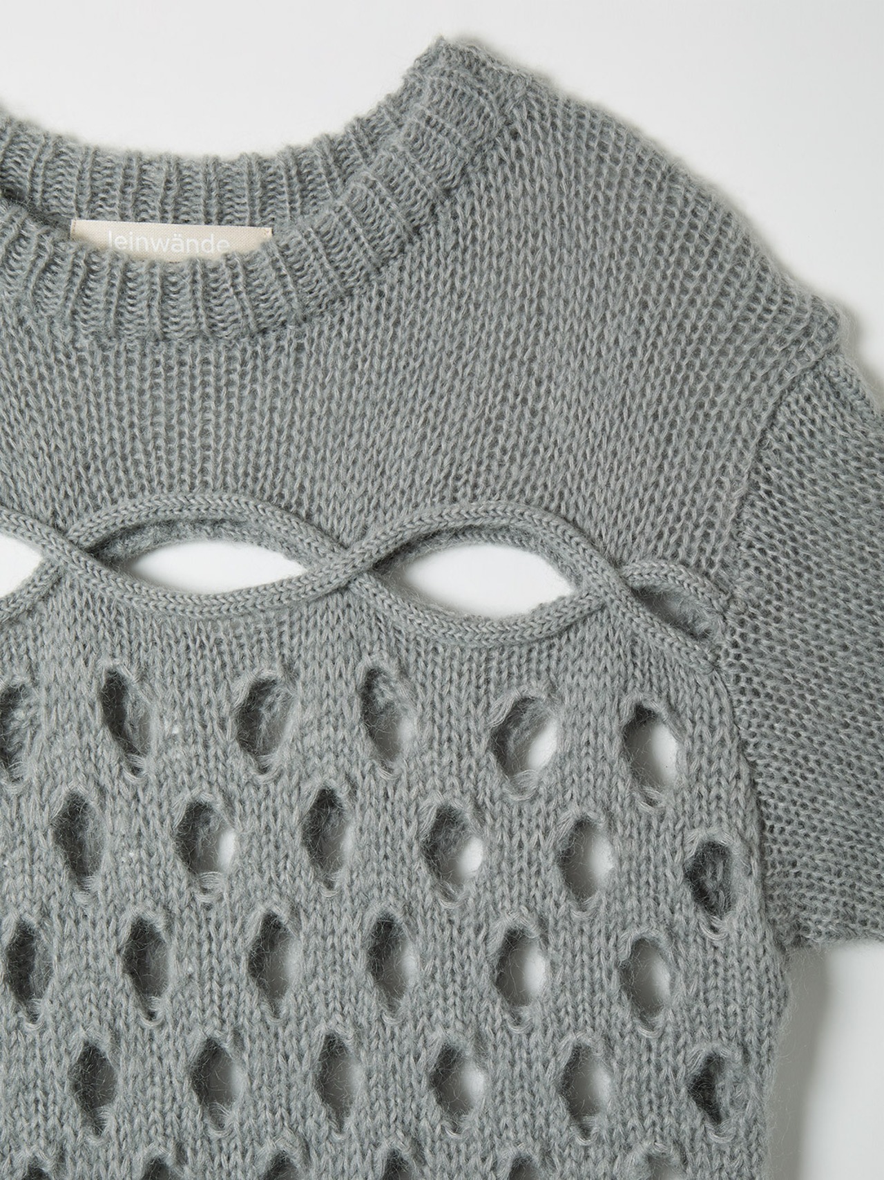 ケーブル編みの網目をたくみにくり抜いたデザインが特徴的なリラックスシルエットのモヘアニット。