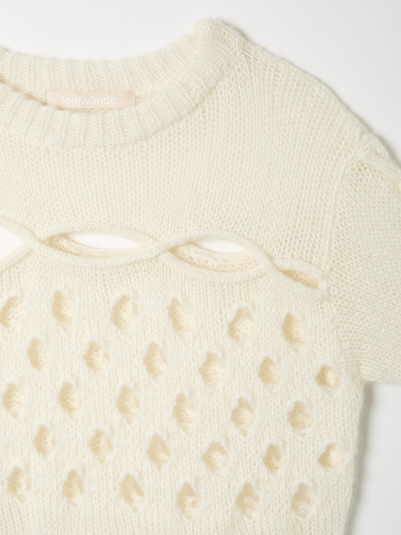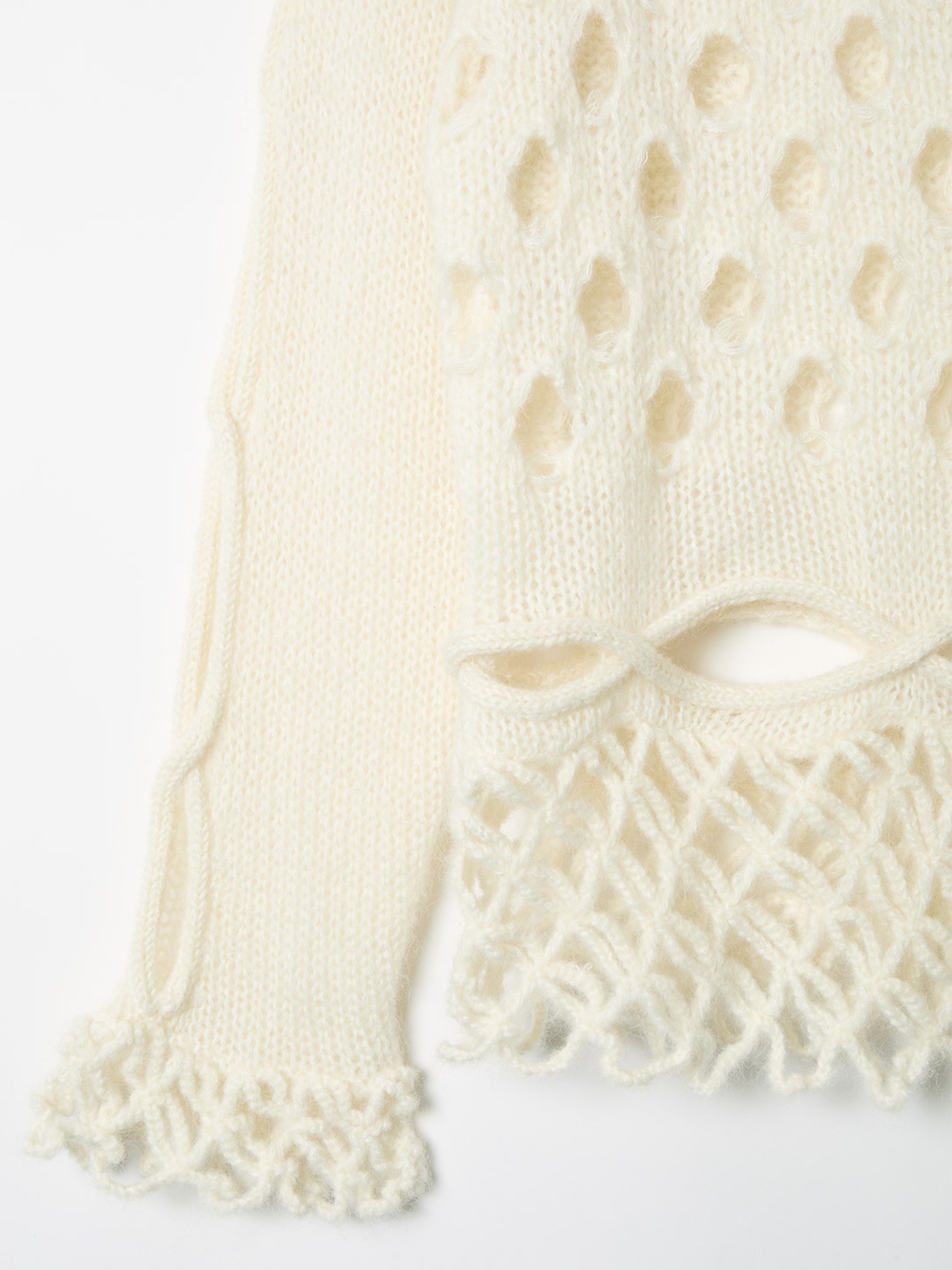 ケーブル編みの網目をたくみにくり抜いたデザインが特徴的なリラックスシルエットのモヘアニット。