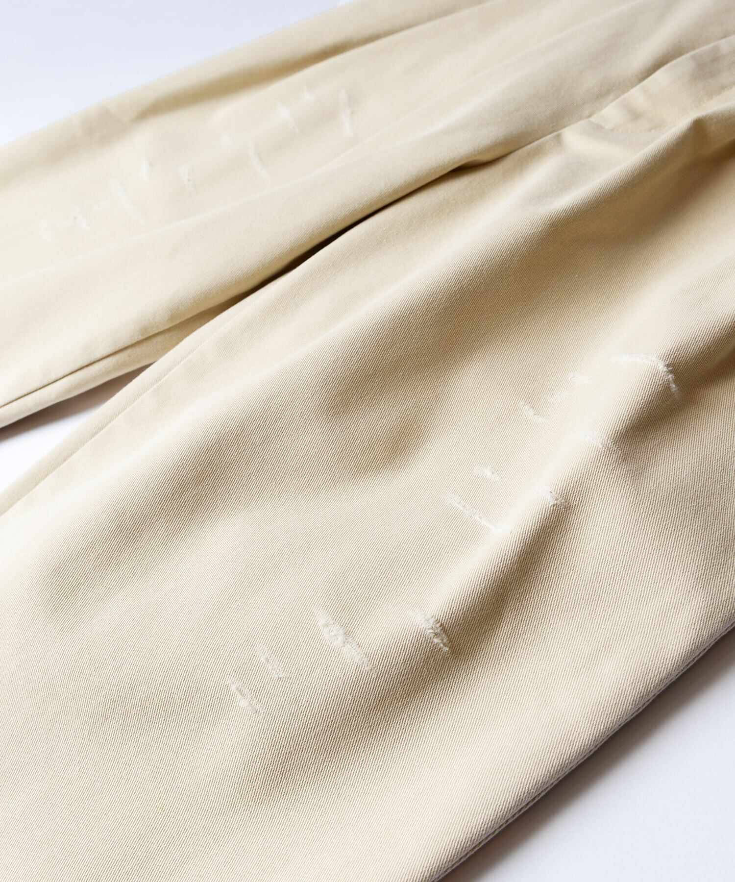ドライな質感で雰囲気のあるノンストレッチのリプロダクトTCツイルを使用。ダメージ加工を施し仕上げに洗いもかけ柔らかな風合いに。