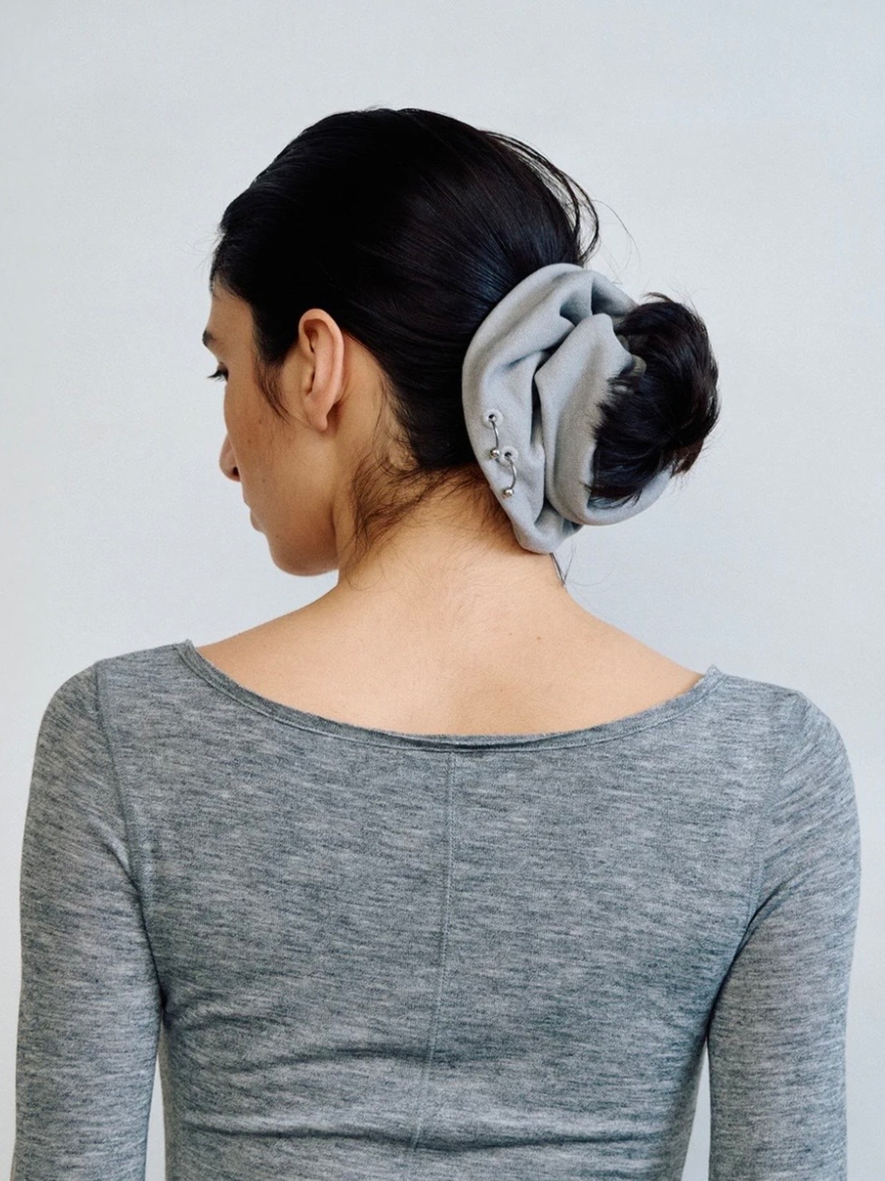 スウェット生地に、ピアスのよ うな金具デザインを施したシュシュ。 素材のラフさとメタルのアクセ ントが程よくミックスされ、まとめ髪にエッジのある雰囲気をプラス。
