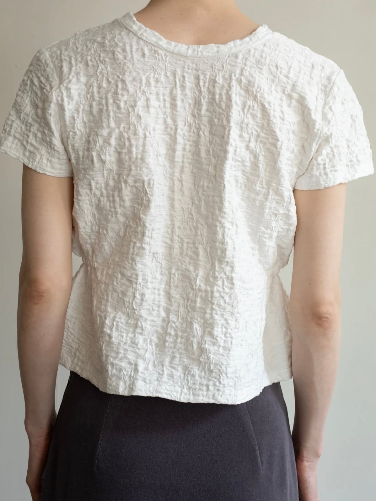 素肌にやさしく寄り添う、オーガニックコットン混のラッセル素材に繊細なシワ加工を施した一枚。ナチュラルな風合いの中に、洗練されたモードな印象を宿します。
