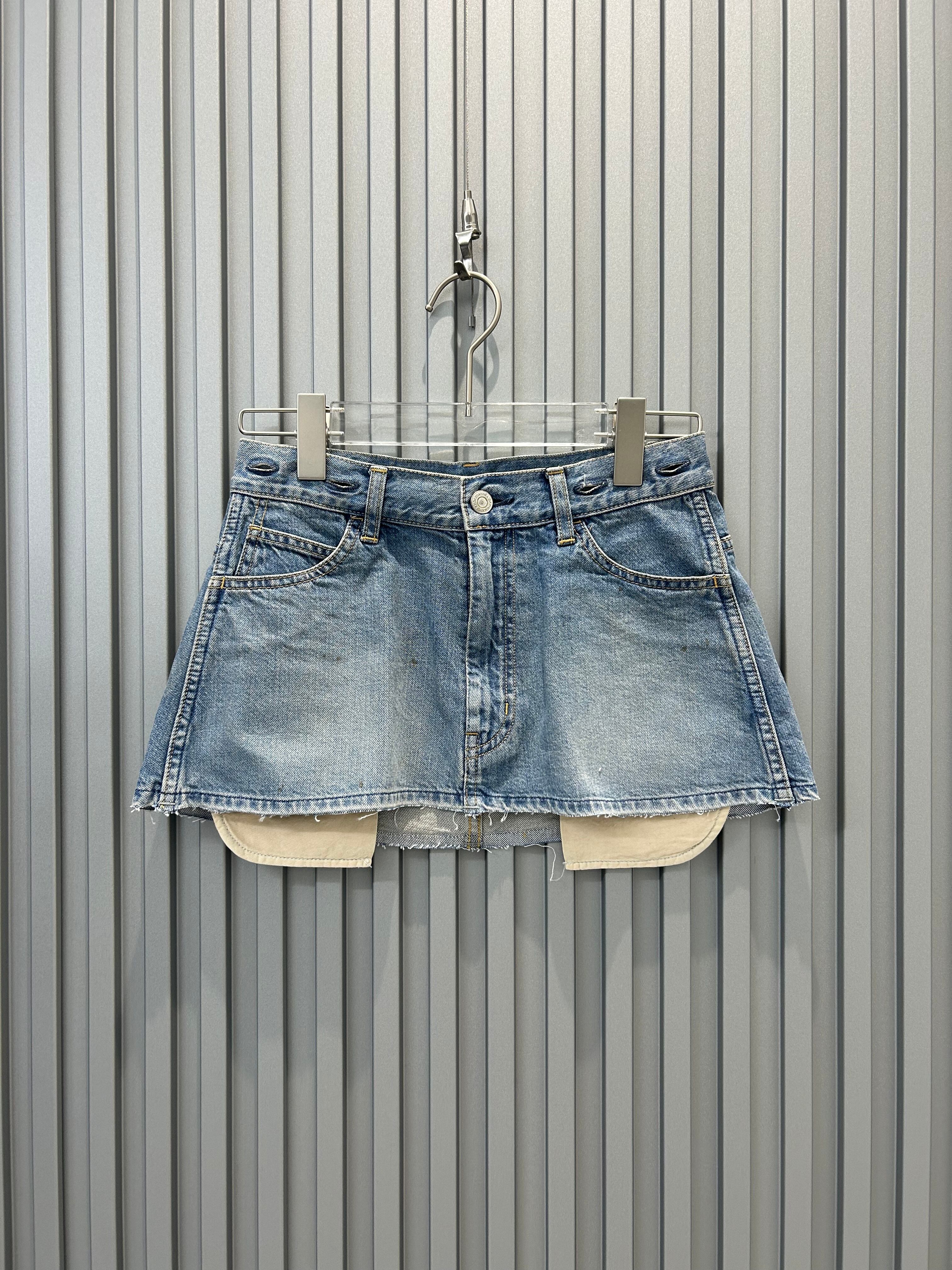 HOLIDAY定番の“HIGH WAIST SKINNY FLARE DENIM PANTS”とデニムミニスカートをレイヤードしたツーピースボトム。