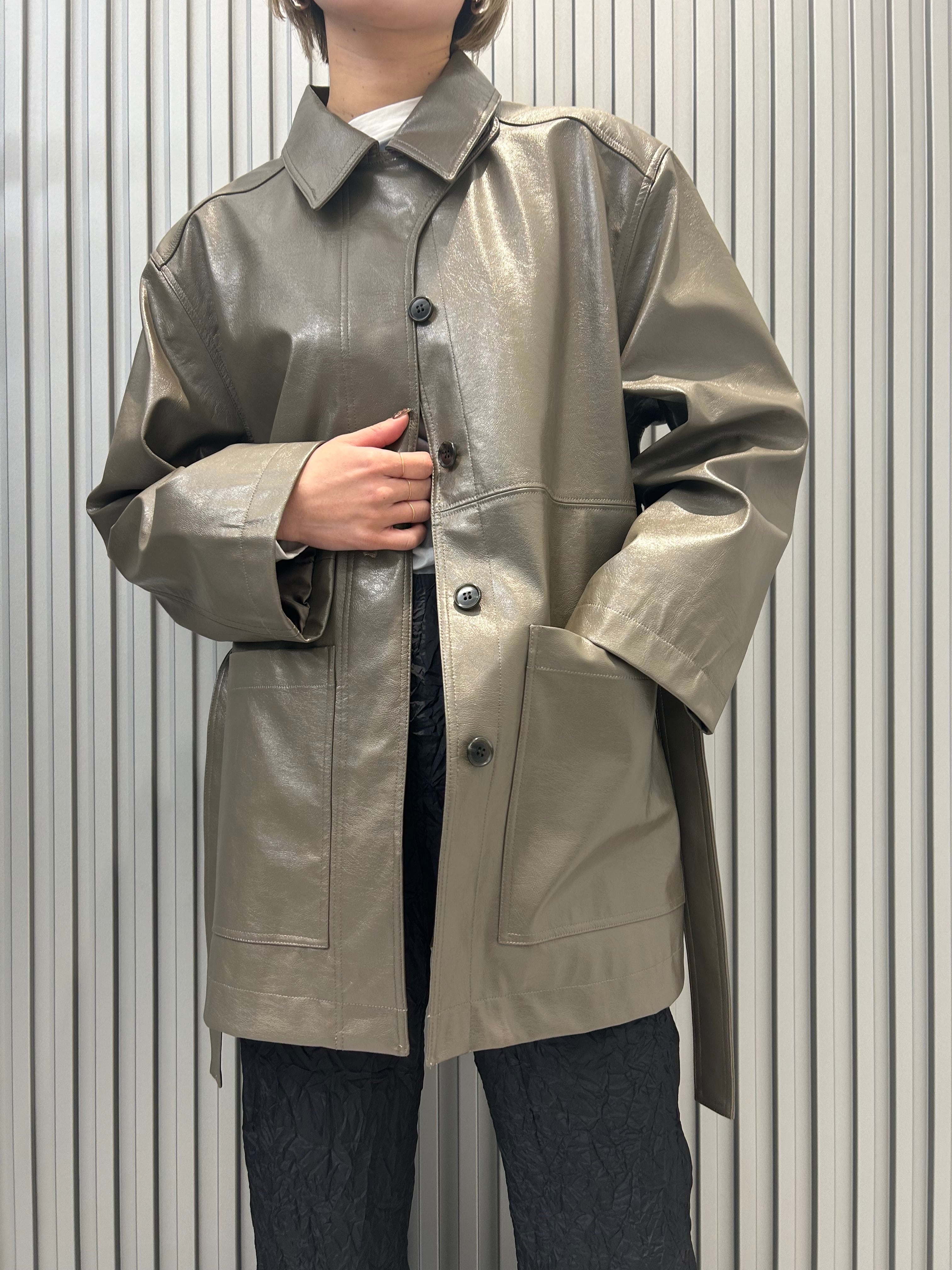ヴィーガンレザーを使用したベルト付きジャケット。