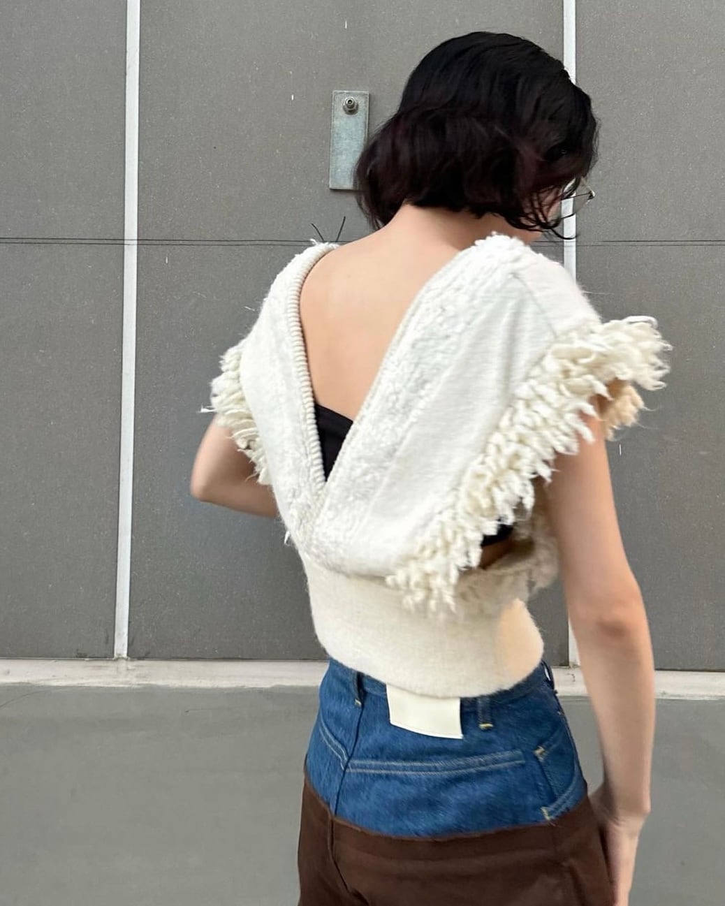 ローゲージのボアモールと呼ばれる糸をベースに、ウール混の起毛たっぷりの糸をかぎ針でループ編みにしたものをつなぎ合わせたコンビネーショントップ。