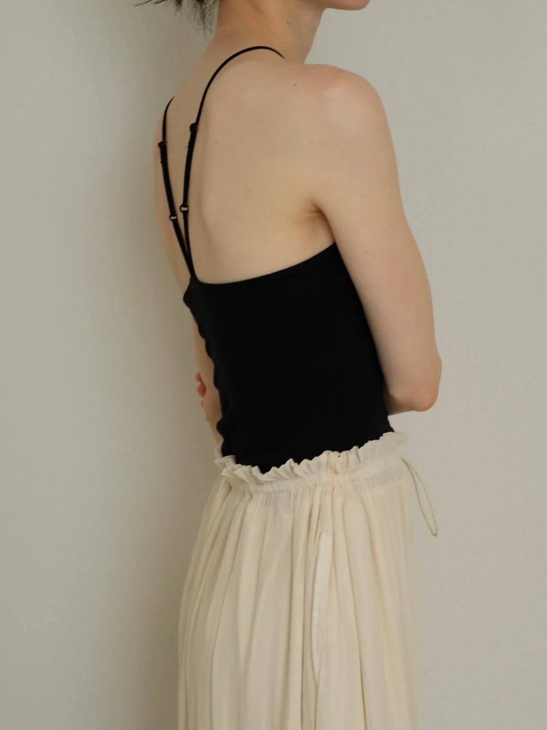 サラリとした肌触りと柔らかい伸縮性を持つベア天竺を使用したブラ付きのアメリカンスリーブキャミソール。