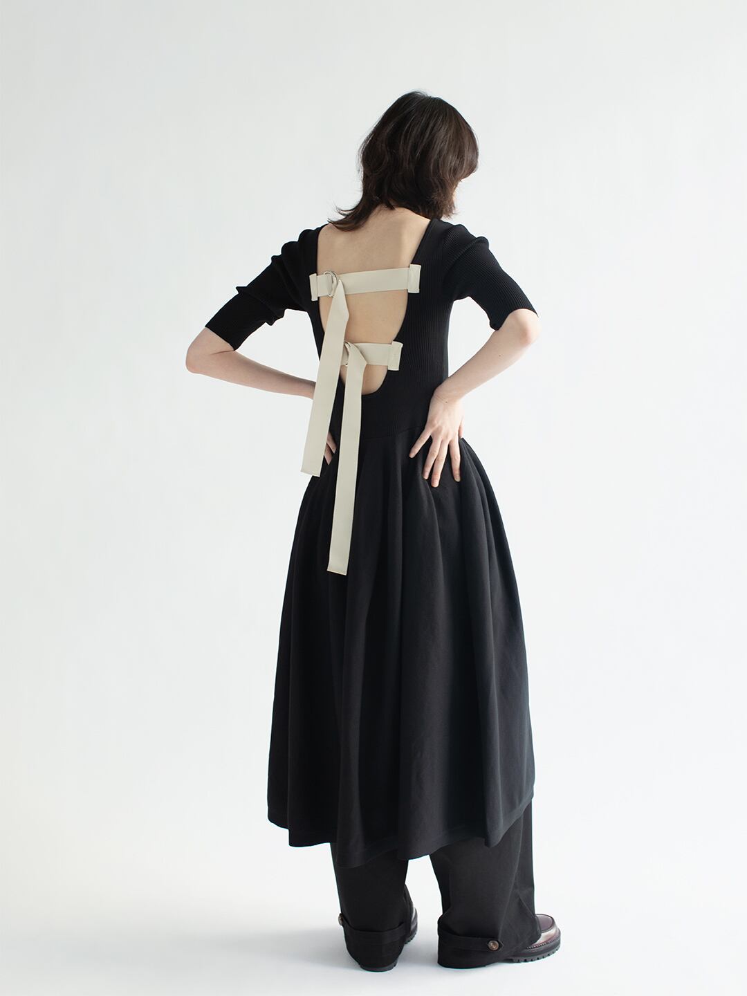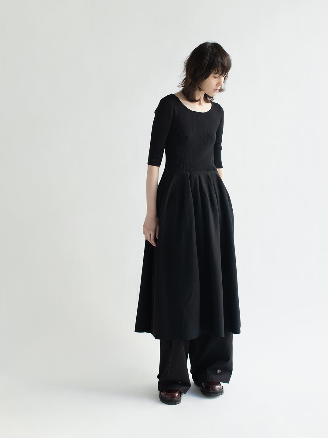 上半身はリブ編み、ハイウエストで切り替えたスカート部分は立体形成で構築的なフォルムを形成したクラシカルで女性的な1枚。